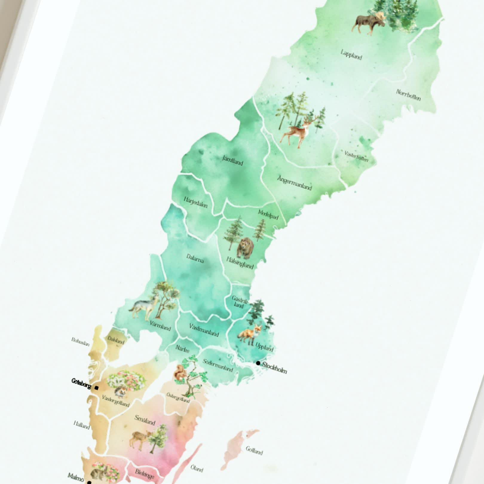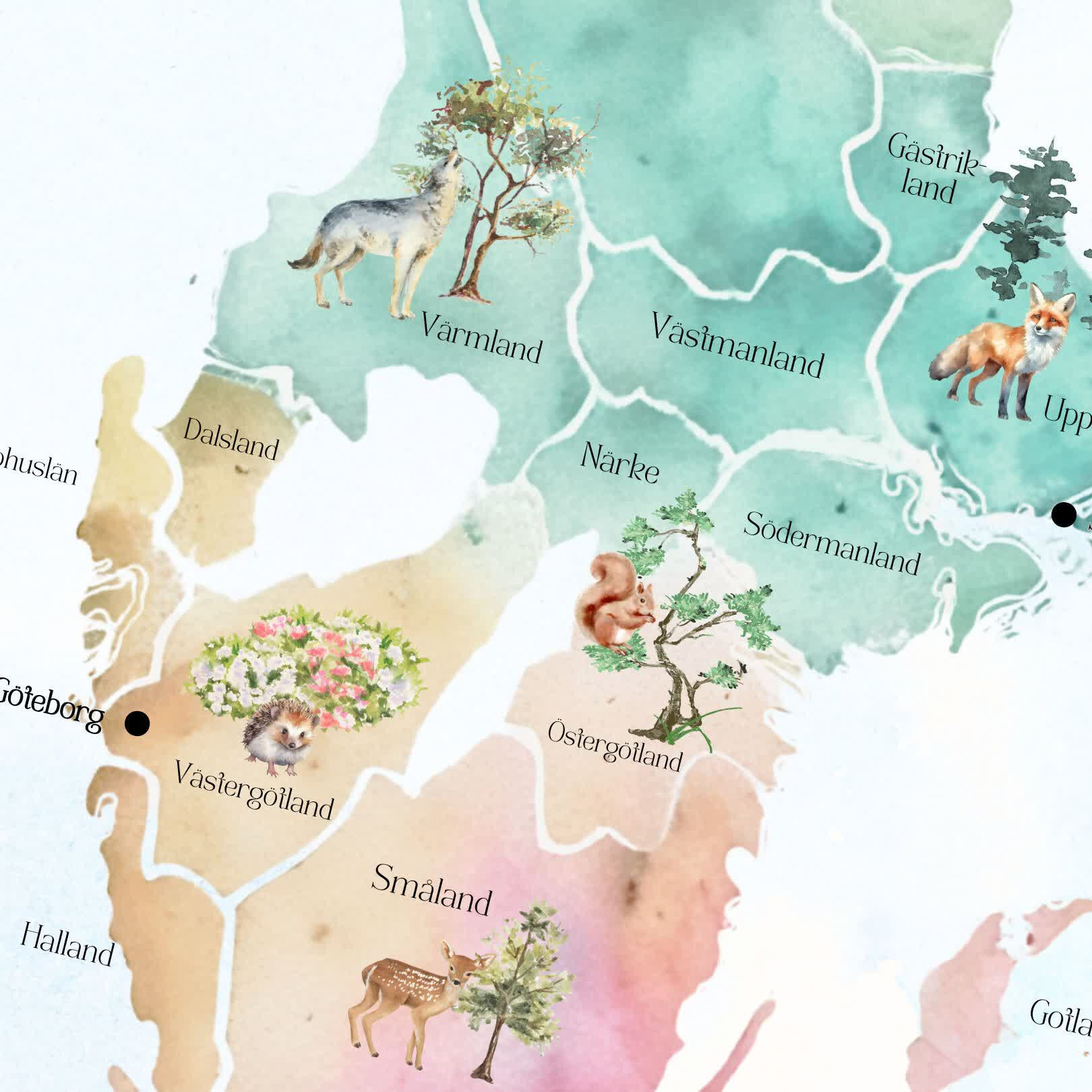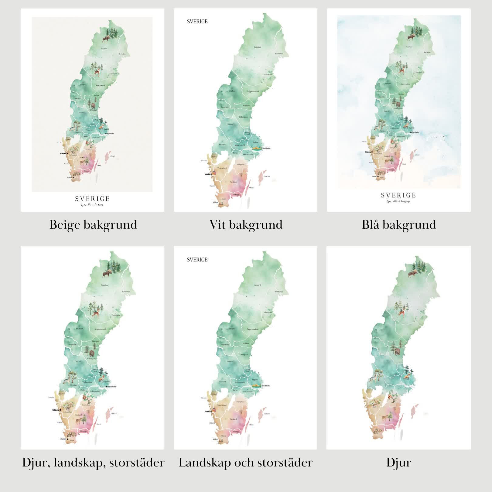 Inspirera och utbilda dina elever med vår vackra Sverigekarta i vattenfärg! Perfekt för klassrummet, denna karta visar Sveriges regioner: Norrland i grönt, Svealand i blått och Götaland i orange. Kartan finns i tre olika bakgrunder: vit, beige eller blå, och rekommenderas i minst A3-format för bästa detaljrikedom.  Varianter. Du får alla 4 olika varianter på köpet: Tom, Landskap och storstäder, Djur och natur eller Landskap, städer, djur och natur.  Denna karta är en ovärderlig resurs som gör klassrummet mer visuellt och lärorikt.