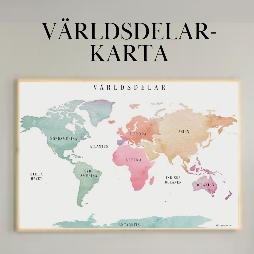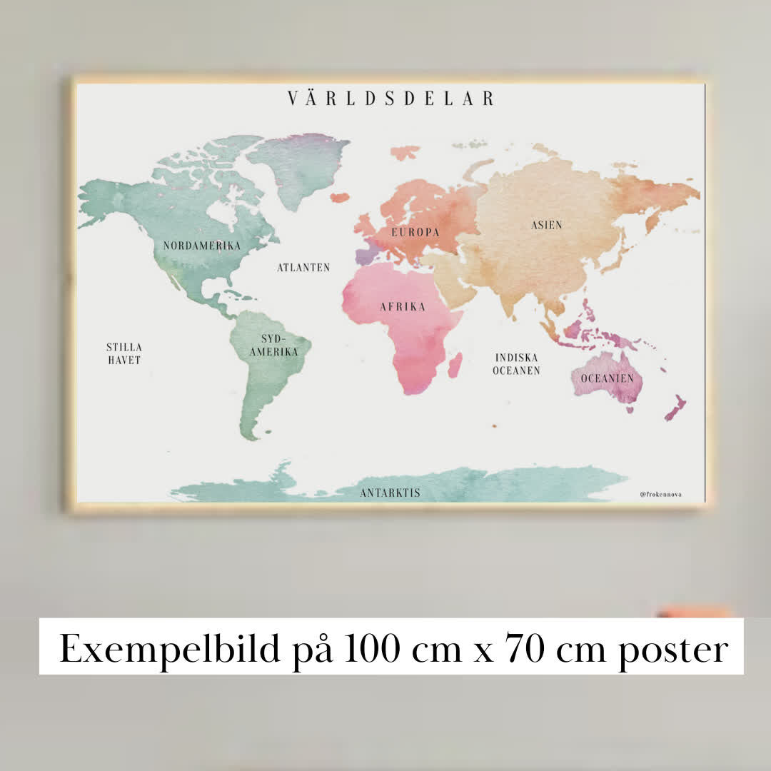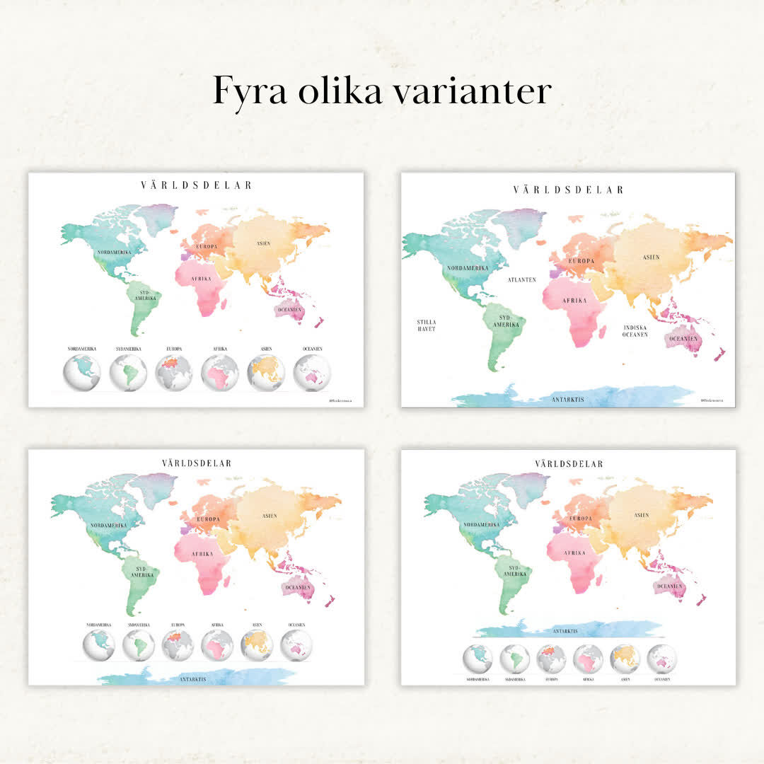 Jättefin vattenfärg pastell världskarta, perfekt till klassrummet  Bifogat material:  – Världskarta med glober, utan hav – Världskarta med glober, med hav – Världskarta med antarktis  – Världskarta färgstark version