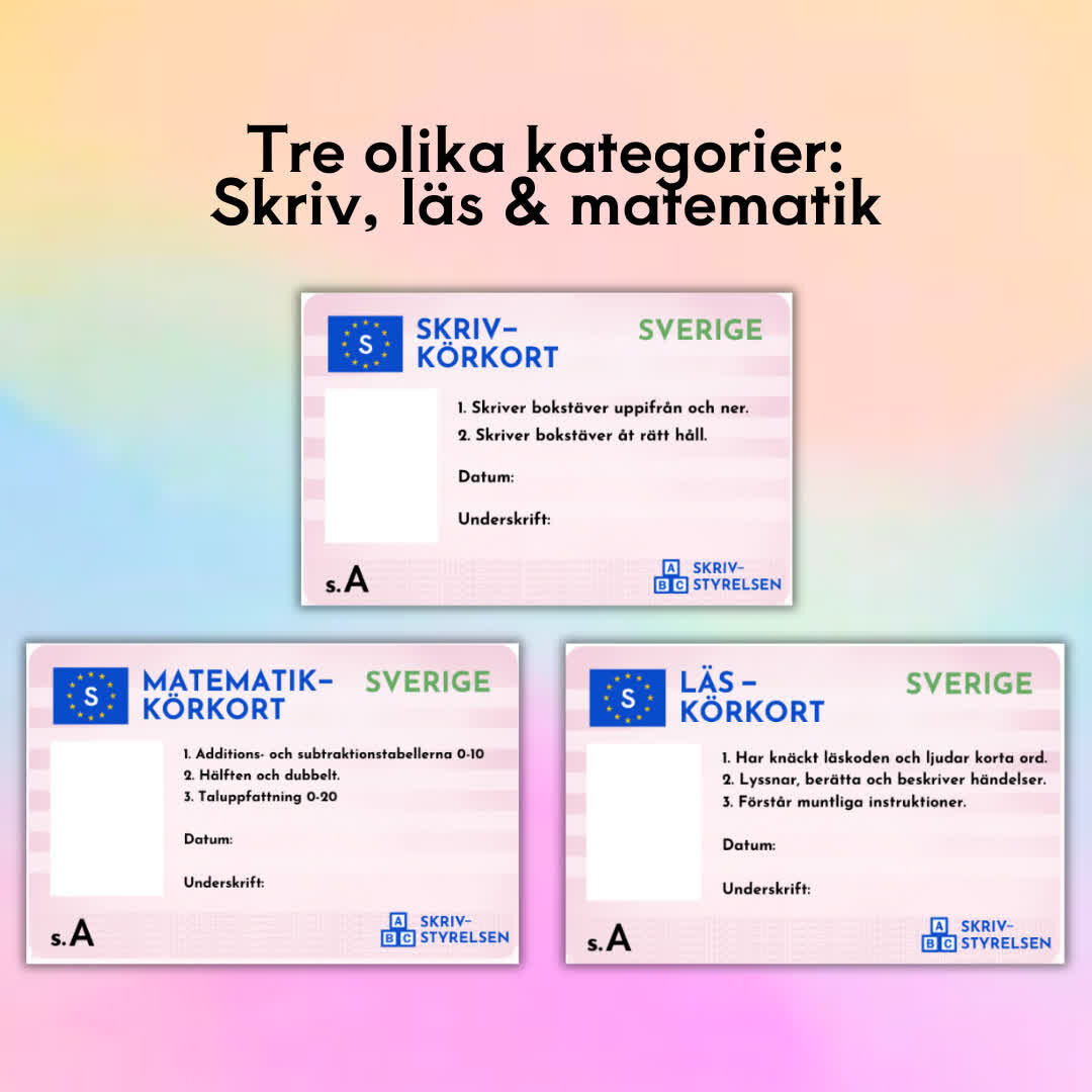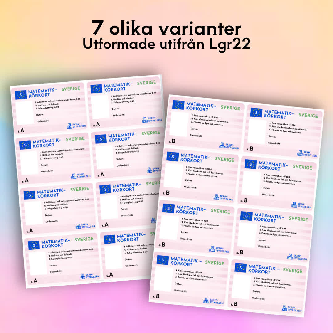 Upptäck vägen till kunskap med Kunskapskörkort i Matematik och Svenska!  Med tre kategorier – Skriv, Läs och Matematik – får eleverna en tydlig struktur för bedömning och måluppfyllelse, samtidigt som de har roligt på vägen till att bli kunskapsmästare.  Skapa en inspirerande och motiverande lärandemiljö genom Kunskapskörkort i Matematik och Svenska. Främja bedömning och måluppfyllelse som en rolig och givande resa för varje elev.  Ge dina elever verktyg för framgång och låt dem navigera mot kunskapens väg med Kunskapskörkort – där varje körkort är ett steg mot framsteg och lärande!