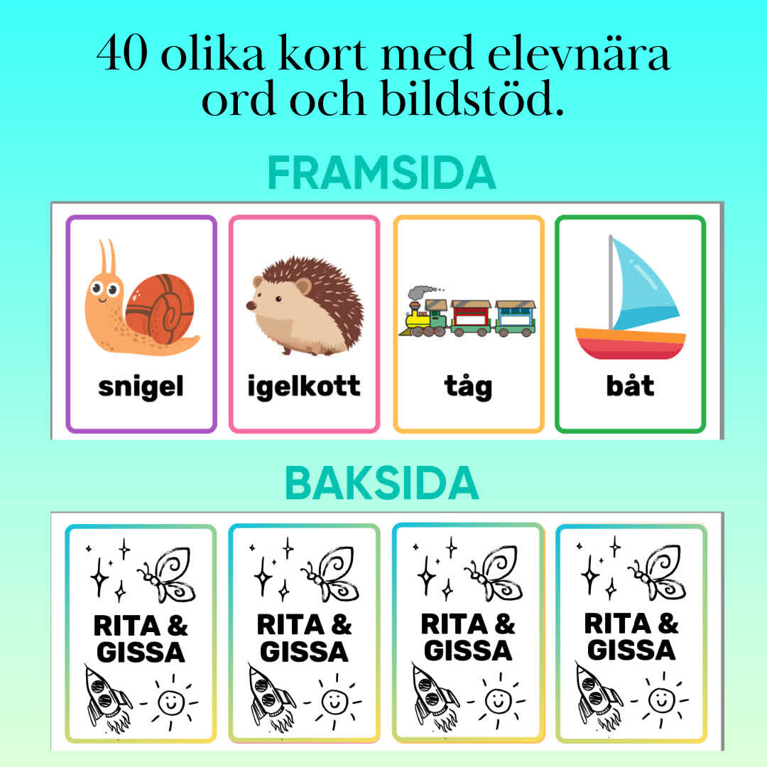 ”Rita & gissa kort” innehåller 40 olika kort med bildstöd för inkludering och åldersanpassning. Använd korten i klassrumsvarianten, gruppvarianten eller två-och-två-leken för en rolig och interaktiv aktivitet.