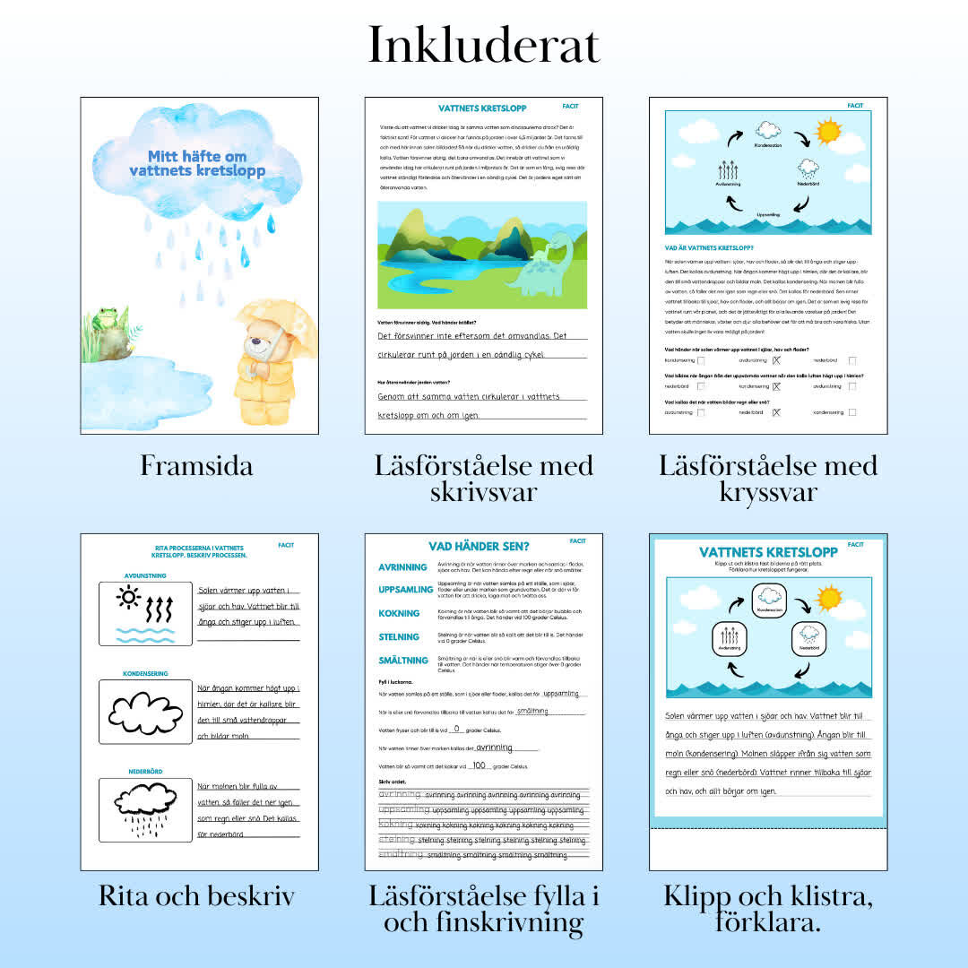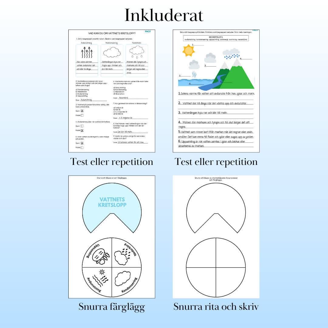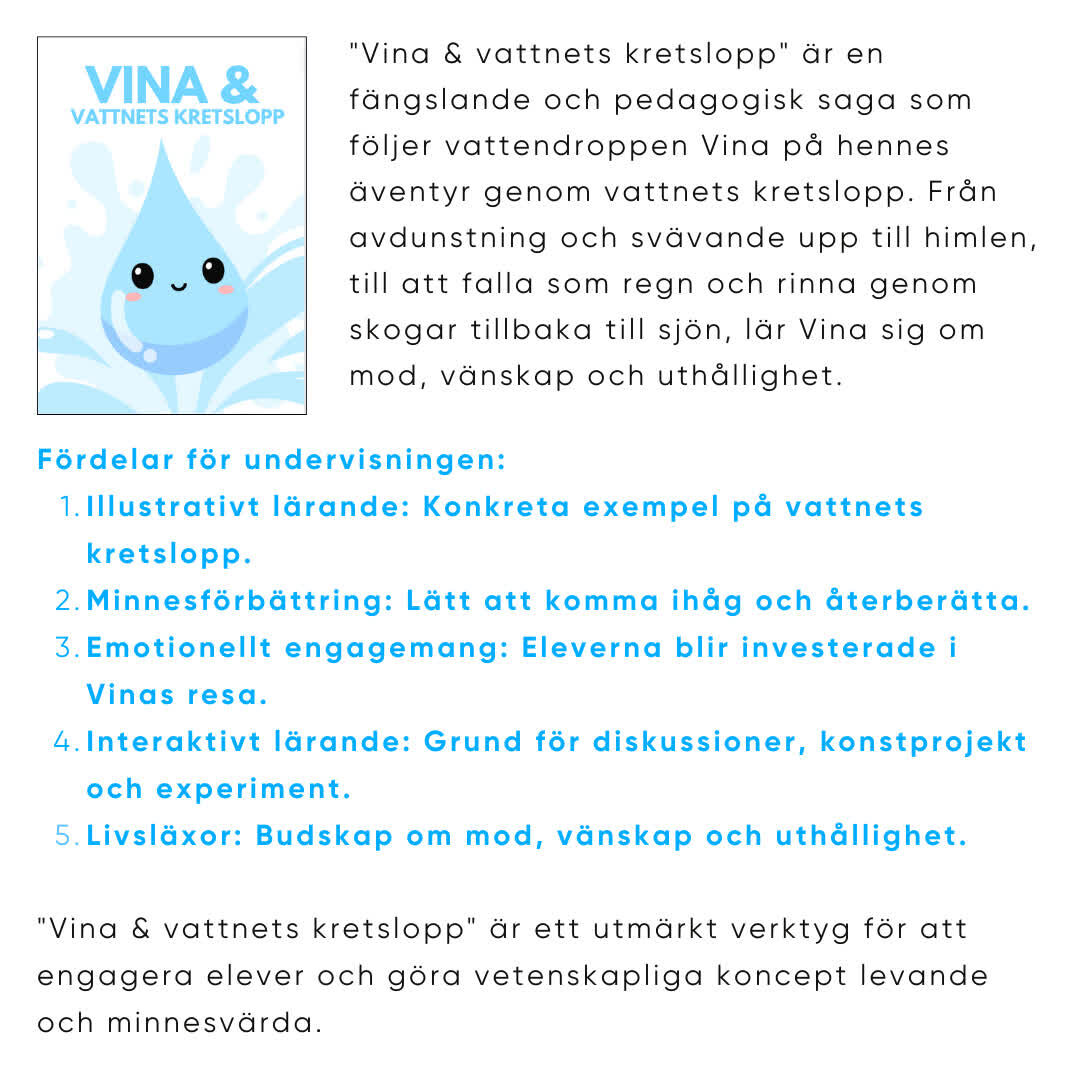 Utforska vattnets cykel med vårt pedagogiska paket! Med 15 sidor innehåller detta paket:  Saga (5 sidor): En engagerande berättelse om vattendroppen Vina som reser genom vattnets kretslopp. Läsförståelsehäfte (6 sidor): Övningar för att fördjupa elevernas förståelse och reflektion över sagan. Klipp- och klistra-aktivitet: Skapa en visuell representation av vattnets kretslopp. Snurra (två varianter): Interaktiva snurror för att förstärka lärandet. Test/repetitionssida: Frågor och övningar för att testa och repetera kunskapen. Lärarfacit Perfekt för klassrumsundervisning, detta paket gör vattnets kretslopp både roligt och minnesvärt genom en kombination av saga, aktiviteter och övningar.