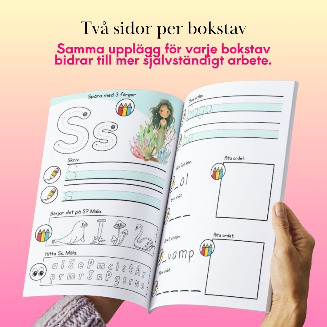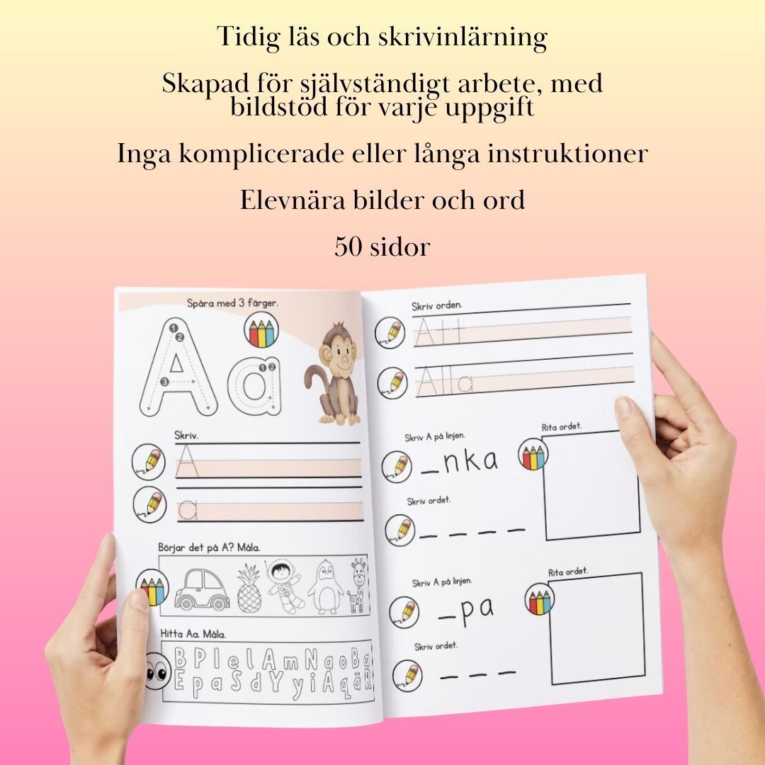Bokstavshäftet är utformat med bildstöd till varje uppgift för att underlätta elevernas förståelse. Här är en genomgång av symbolerna:  Pennan betyder: Skriv. Eleverna ska använda pennan för att skriva eller spåra bokstäverna.  Färgpennorna betyder: Måla. Eleverna ska färglägga och markera specifika delar i övningarna.  Ögonen betyder: Leta. Detta innebär att eleverna ska använda sina ögon för att leta efter rätt svar eller information i bilderna.  Detta system är särskilt utformat så att även de elever som ännu inte kan läsa kan följa instruktionerna på egen hand. Gå igenom symbolerna tillsammans med eleverna innan ni börjar arbeta i häftet. För de elever som kan läsa finns även textbeskrivningar som stöd.  Genom att använda dessa tydliga symboler blir det enkelt för alla elever att förstå vilken aktivitet som förväntas, oavsett läsförmåga. Detta skapar en inkluderande miljö där alla elever kan delta och utföra uppgifterna på sitt sätt.  Bokstavshäftet innehåller två sidor per bokstav, där varje bokstav följer samma tydliga struktur. När eleverna blivit bekanta med upplägget kan de genomföra övningarna självständigt.