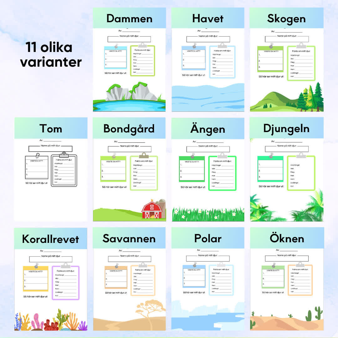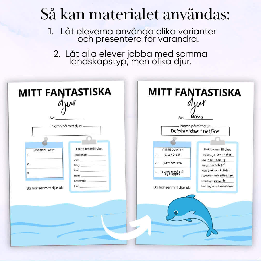 ”Mitt fantastiska djur – projektarbete” är ett engagerande arbetsblad som låter eleverna utforska djur och deras hemmiljöer på ett kreativt sätt. På arbetsbladet får eleverna skriva djurets namn, tre roliga fakta, samt lista kännetecken som vikt, mat, färg, och andra egenskaper. Detta uppmuntrar eleverna att lära sig mer om djuren samtidigt som de förbättrar sina skriv- och forskningsfärdigheter. På ett separat papper målar eleverna djuret, klipper ut bilden och klistrar fast den på arbetsbladet, vilket ger en färgglad och personlig touch till deras arbete. Perfekt för projektarbeten om djur i naturkunskapen.