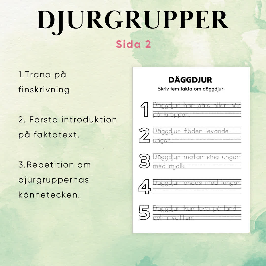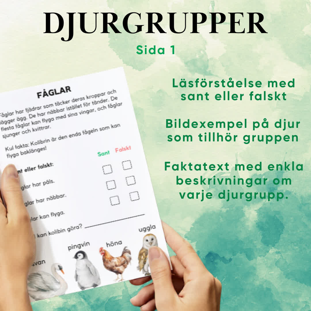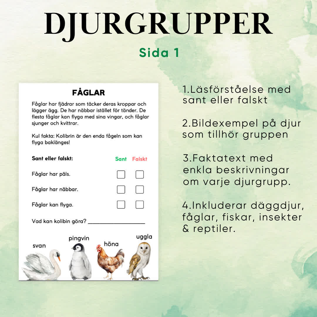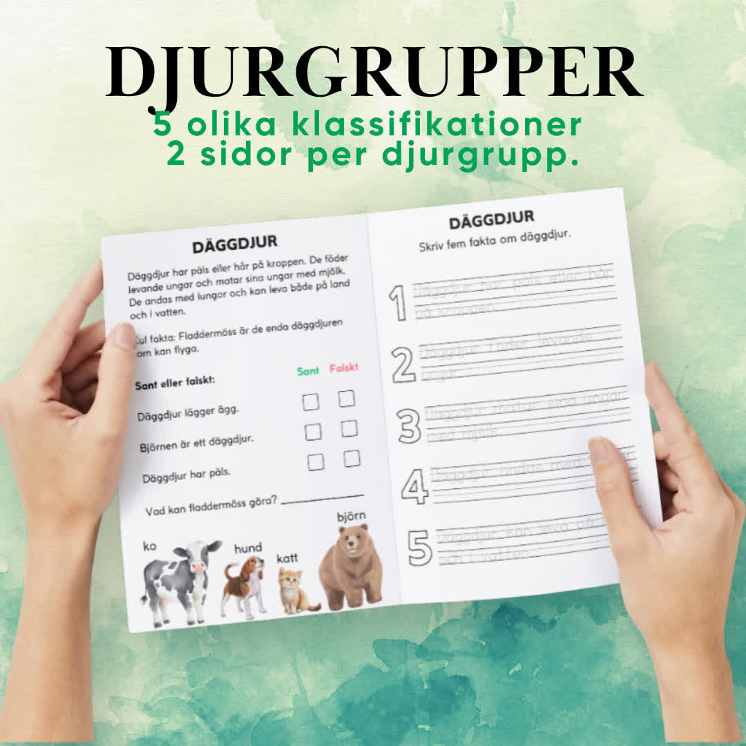 Djurgrupper är ett lärorikt material med 10 sidor som introducerar barn till fem vanliga djurgrupper. Med faktatexter, läsförståelsefrågor och bilder av typiska djur inom varje grupp, erbjuder materialet en interaktiv inlärningsupplevelse som även stärker finmotoriken och skrivförmågan.