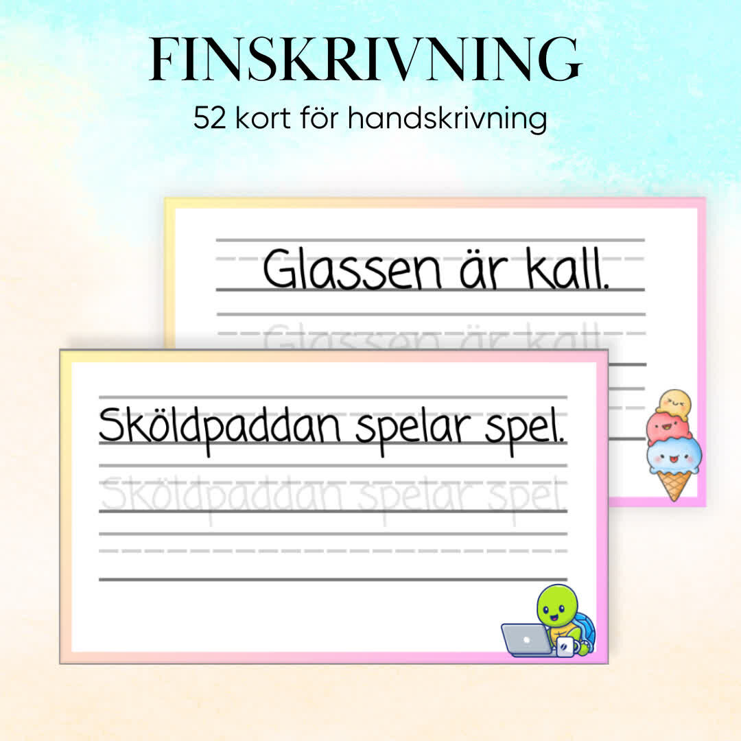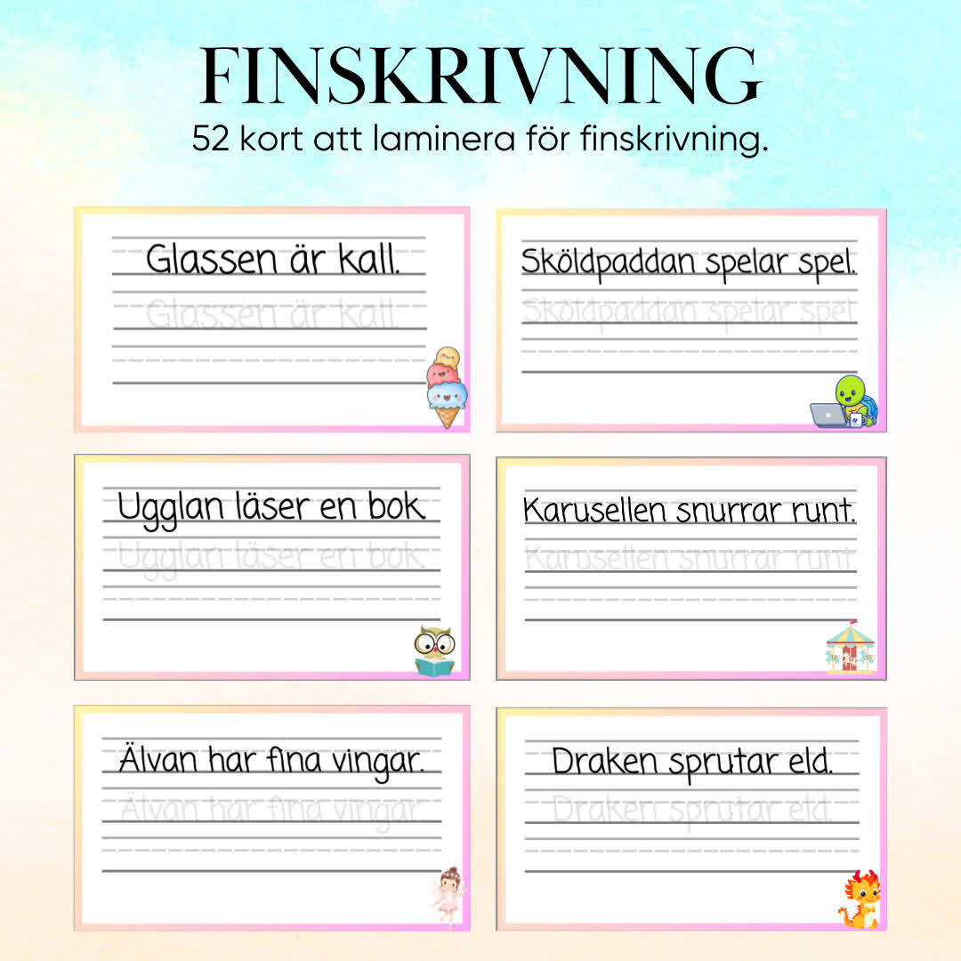 Detta paket innehåller 52 finskrivningskort utformade för att förbättra elevers handskrivning. Korten har elevnära texter som motiverar och engagerar eleverna i deras skrivträning. Läraren kan välja att laminera korten så att eleverna kan använda whiteboardpennor och skriva om och om igen, eller skriva ut korten så att eleverna kan öva på papper. Detta flexibla och inspirerande material stödjer utvecklingen av tydlig och korrekt handskrift.