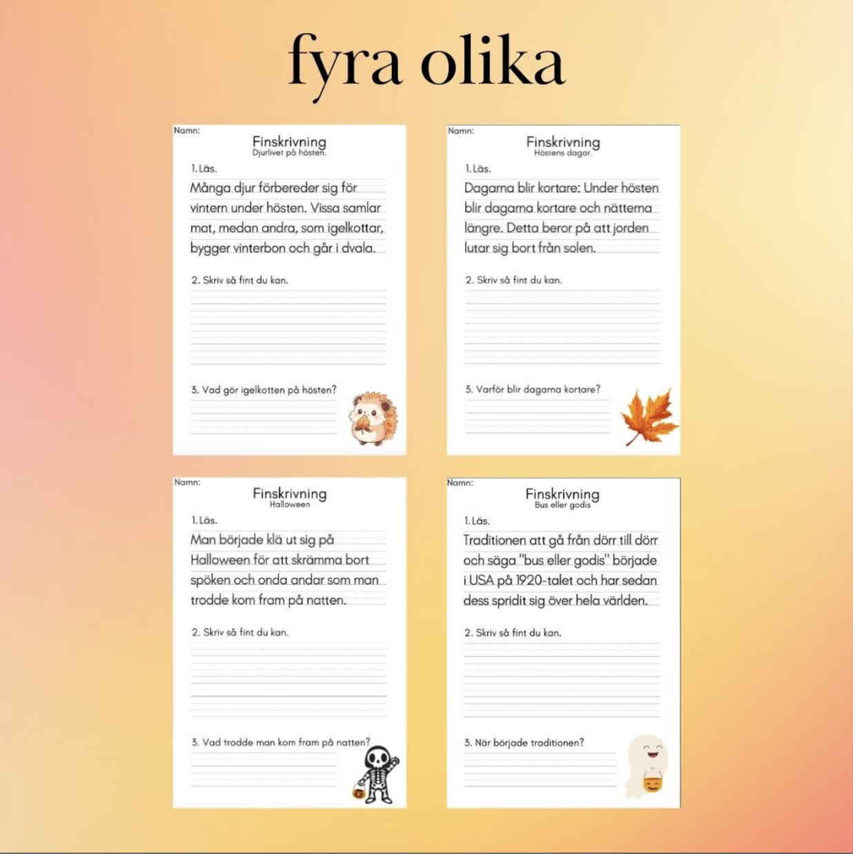 Finskrivning Höst och Halloween är ett roligt och pedagogiskt material för elever i årskurs 2–3. Det innehåller fyra finskrivningsövningar: två med hösttema och två med halloweentema. Varje övning har längre texter och stödlinjer som hjälper eleverna att öva sin handstil och skriva tydligt och prydligt