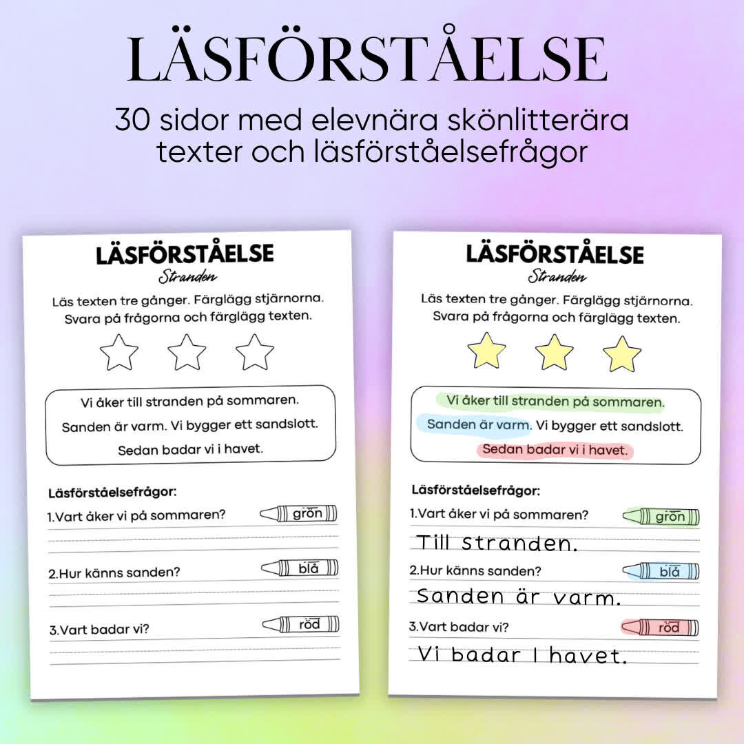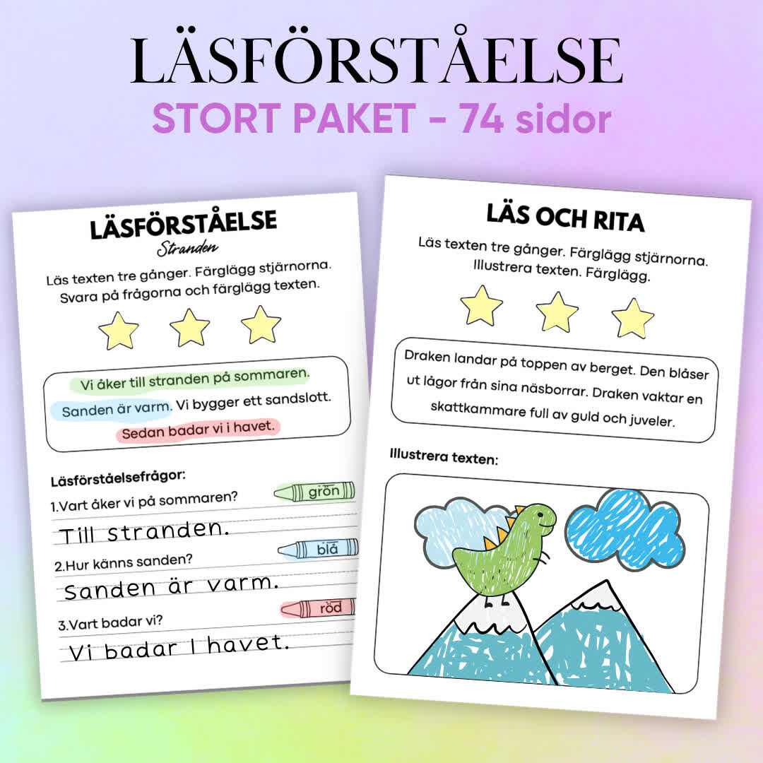 Detta omfattande läsförståelsepaket erbjuder 74 sidor med två olika typer av engagerande uppgifter. Den första uppgiften består av skönlitterära texter där eleven får läsa texten tre gånger, svara på frågor och färglägga texten. Den andra uppgiften är en läs och rita-övning, där eleven läser en beskrivande text tre gånger och sedan illustrerar den. Detta paket är ett roligt och kreativt sätt att träna läsförståelse och visualisering, med teman som är både elevnära och fantasifulla. Perfekt för att uppmuntra fantasi och fördjupa förståelsen av texter.
