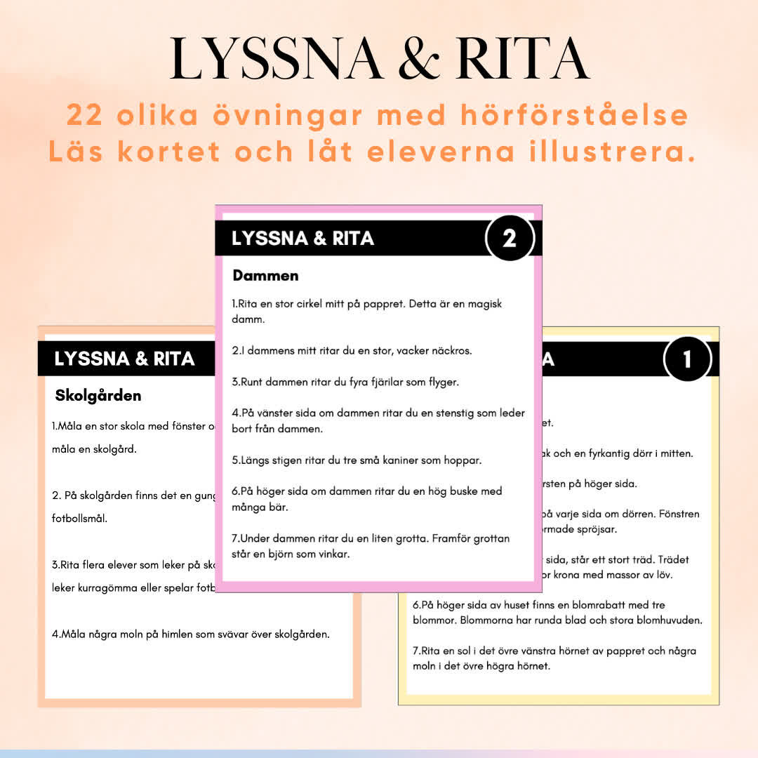 ”LYSSNA & RITA” är ett roligt sätt att förbättra hörförståelsen i klassrummet. Läraren läser upp instruktioner från ett kort och eleverna ritar det de hör. Innehåller 22 kort med elevnära instruktioner.