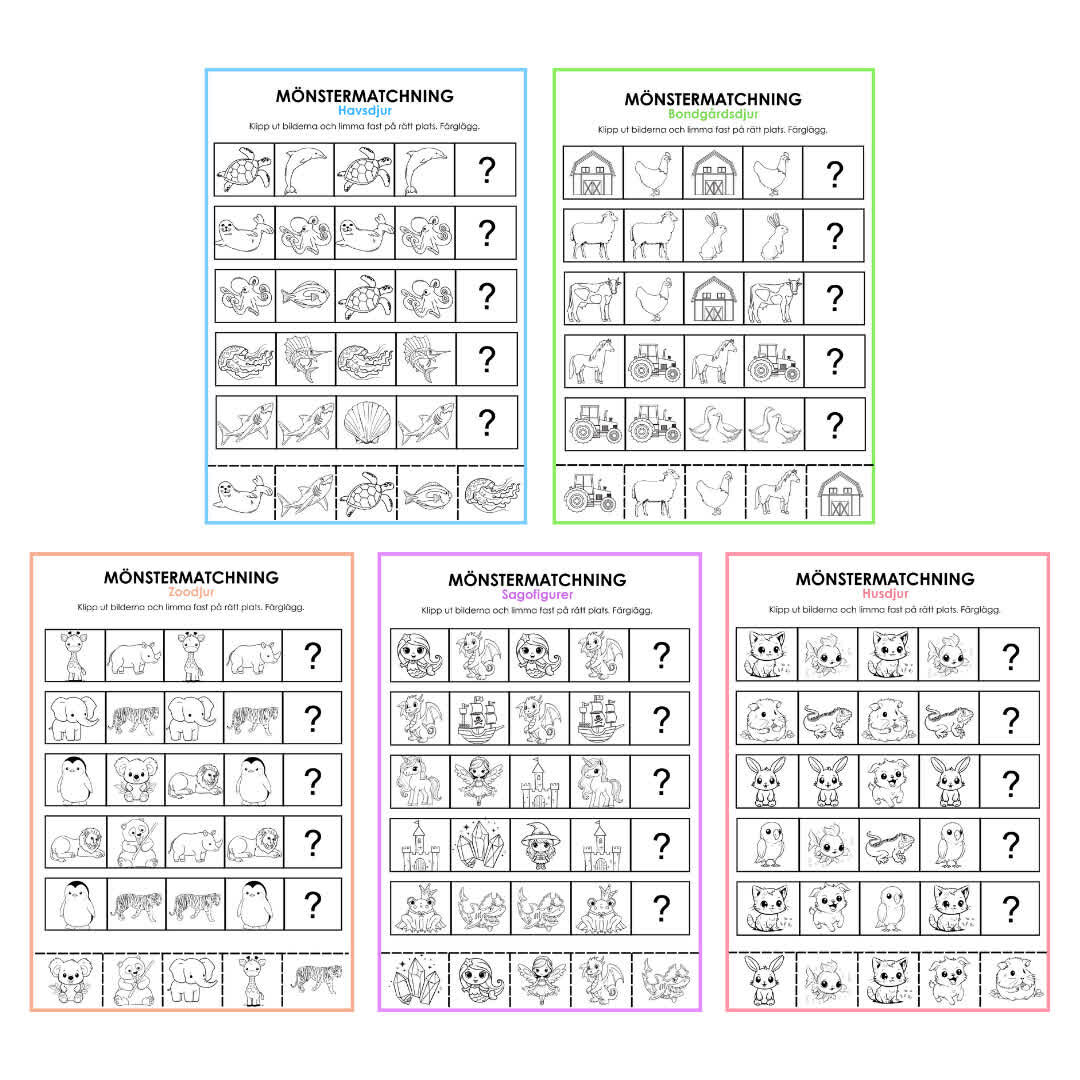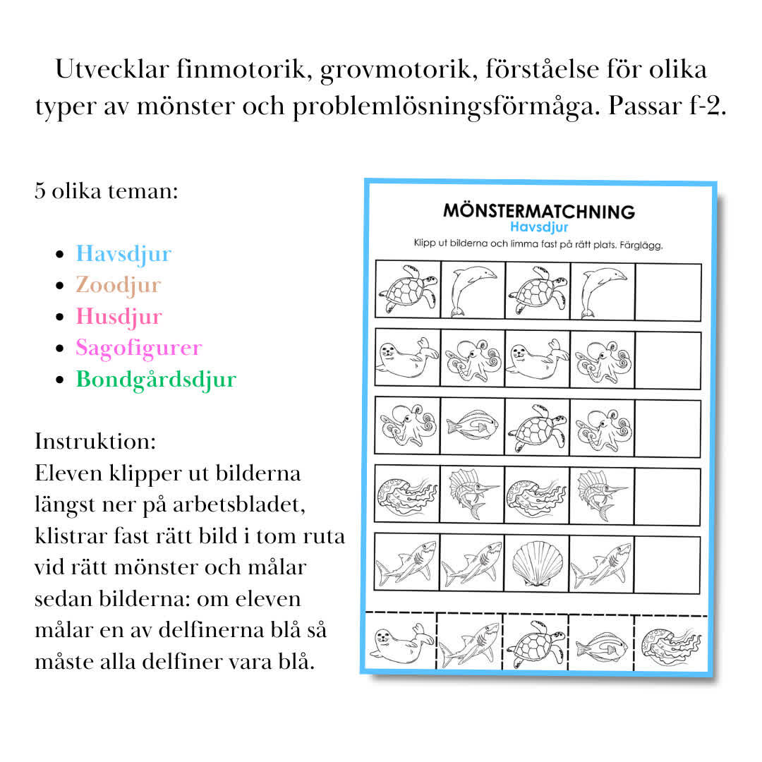 Upptäck Mönstermatchning – det perfekta materialet för elever i förskoleklass till årskurs 2! Designat för att göra lärandet om mönster roligt och lättförståeligt för de yngsta eleverna. Genom spännande och interaktiva aktiviteter, såsom klippning, klistring och målning, introducerar Mönstermatchning dessa elever till grundläggande mönsterigenkänning och problemlösning. Arbeta ämnesöverskridande för att stärka finmotoriska och grovmotoriska färdigheter samtidigt som lärandet blir både engagerande och utvecklande. Ge dina elever en lekfull introduktion till mönster med Mönstermatchning!