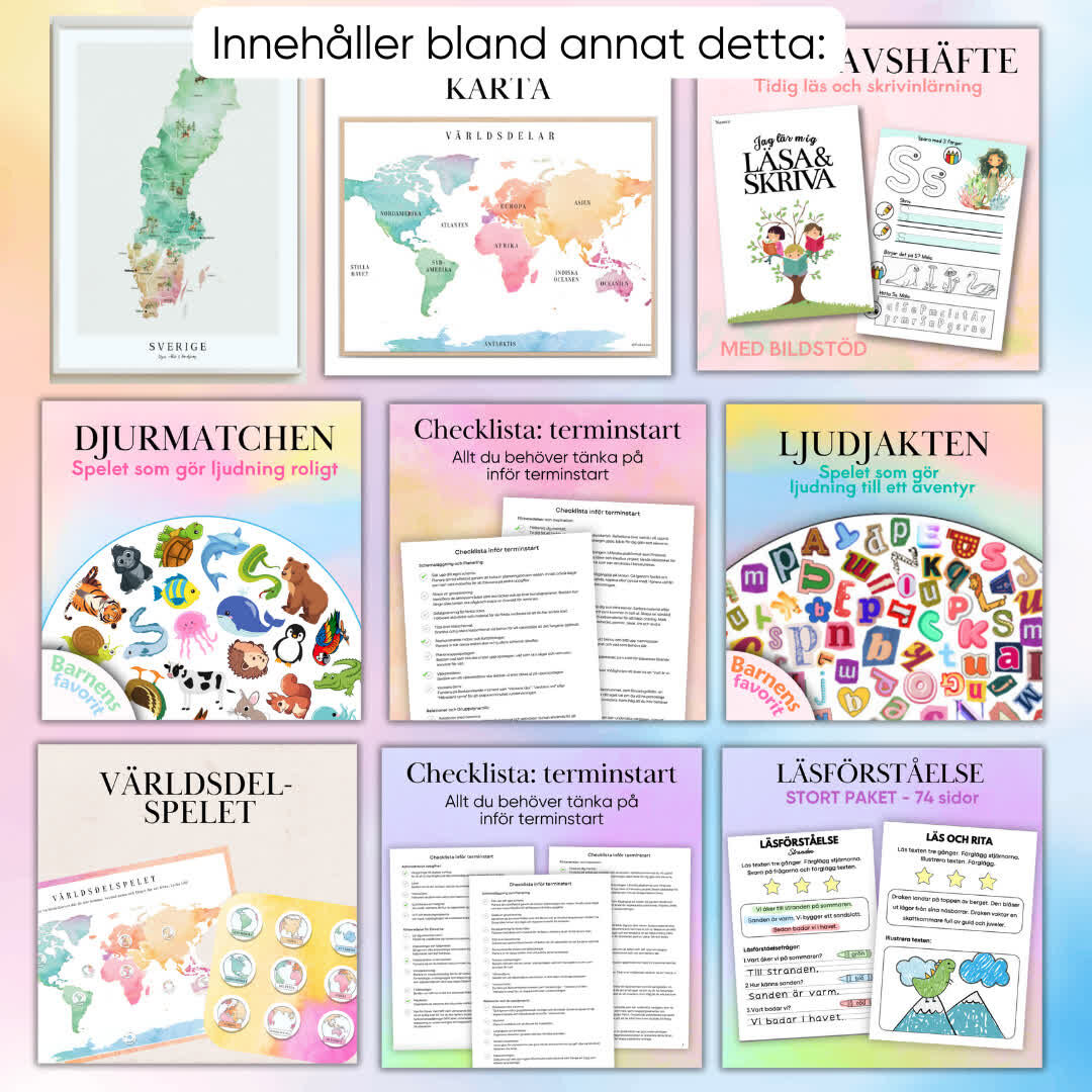 Detta paket är fyllt med allt du behöver för att inspirera och underlätta din undervisning – från konkretiserande material och utförliga checklistor till kreativa bokstavshäften, spel, memory, kartor och läsförståelseövningar. Perfekt för dig som vill ha en komplett verktygslåda för att engagera dina elever och skapa en strukturerad och rolig inlärningsmiljö. Missa inte chansen att få alla favoriter samlade i ett prisvärt paket! Fyllt med pedagogiska verktyg som konkretiseringar, checklistor, spel, läsförståelse och mer – allt du behöver för att göra undervisningen både rolig och effektiv. Perfekt för att skapa struktur och variation i klassrummet!